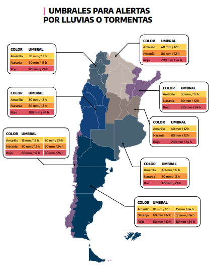 Para los alertas de nivel rojo se toma un periodo de 24 horas. Los umbrales considerados para la Patagonia se obtuvieron de un estudio que comparaba eventos pasados con datos de impacto.