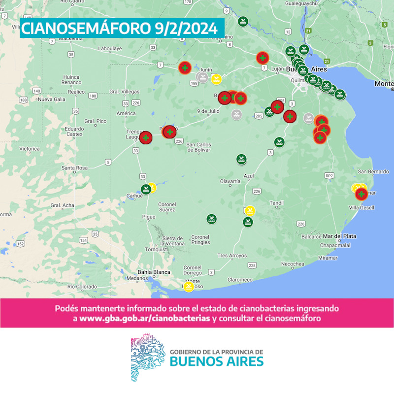 El cianosemáforo se puede consultar en gba.gob.ar/cianobacterias dónde también se puede encontrar material descargable para difusión sobre qué son y cómo actuar ante su contacto.