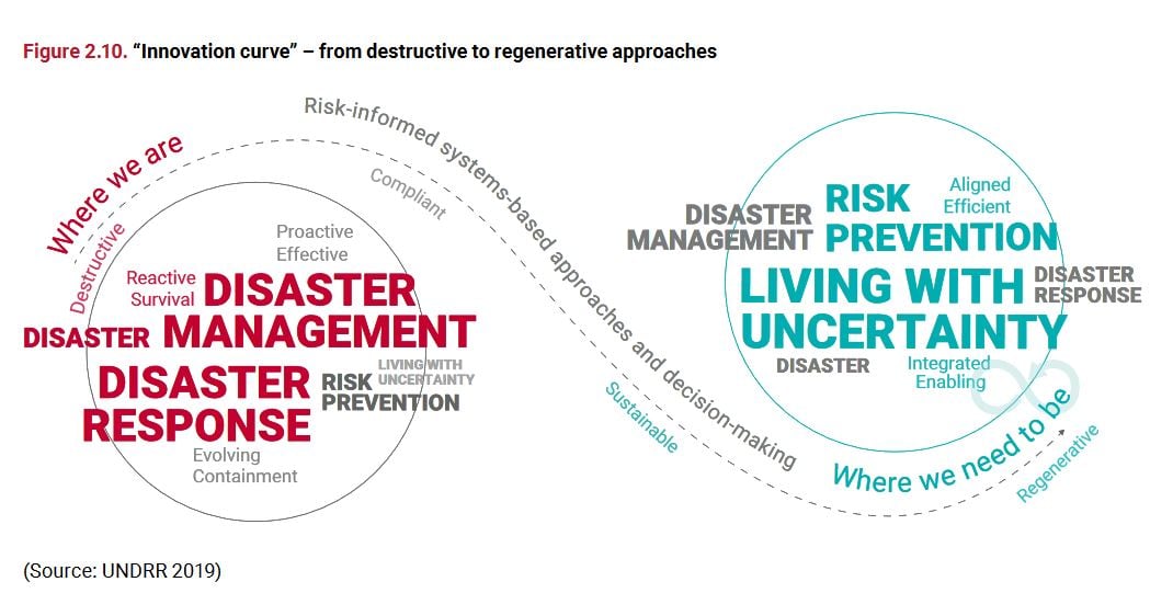 Fundamentalmente, la RRD logra reducir el riesgo mediante el desarrollo de las fortalezas, atributos y recursos disponibles dentro de una comunidad, sociedad u organización, conocidos colectivamente como su capacidad . Las actividades de GRD están diseñadas para aumentar la resiliencia de las personas, las comunidades, la sociedad y los sistemas para resistir, absorber, adaptarse, recuperarse y mejorar el bienestar ante múltiples amenazas. Por lo tanto, las actividades de reducción y gestión de riesgos pueden proporcionar una vía para desarrollar resiliencia ante otros riesgos. Además del desarrollo, la GRD debe integrarse en diversos sectores, incluyendo el cambio climático y los conflictos.