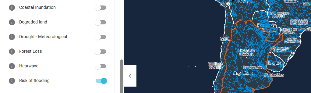 Del lado izquierdo de la pantalla aparece un listado de riesgos y amenazas para seleccionar y ver en tu geolocalización elegida.