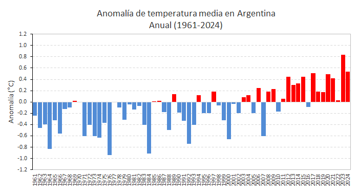 Anomalías de temperatura media en Argentina desde 1961 a 2024, con respecto al valor medio 1991-2020. En barras rojas se representan las anomalías positivas y en barras azules, las negativas