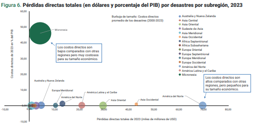 Como se indica en el cuadro por ejemplo, en 2023 la exposición económica de Norteamérica a desastres, que totalizó 69.570 millones de dólares en pérdidas directas, fue mayor que la de cualquier otra región del mundo, pero solo representó el 0,23 % del Producto Interno Bruto (PIB). En cambio, Micronesia sólo sufrió pérdidas por 4.300 millones de dólares, pero estas representaron el 46,1 % del PIB.